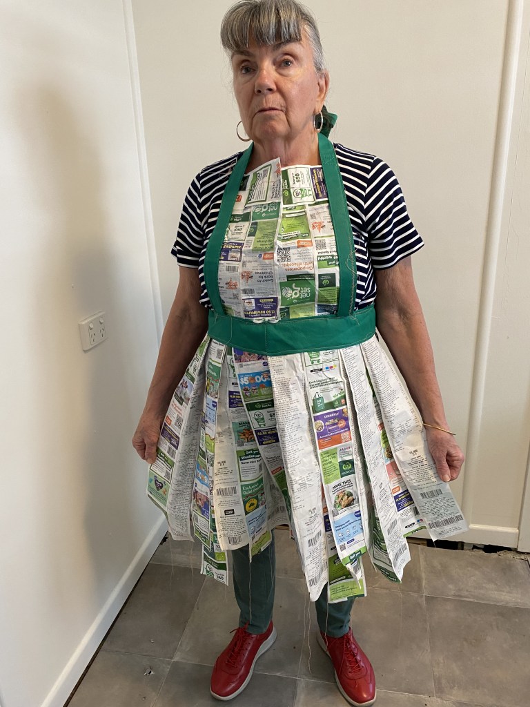 W is for women’s work, 2022, costume made from hi vis vests, tulle, assorted hi vis materials, cotton, CHUX bandana. Commissioned work for the Judith Wright Arts Centre windows. Images: Hayley Roberts.